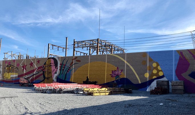 A precast wall was specified to protect future residents from an adjacent industrial yard. The wall would create a visibility shield as well as provide a natural stone façade. To further integrate with the surrounding community, murals by local artists were painted on the walls.